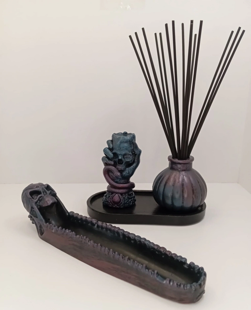 Gotik ve mistik dekorasyon tarzını benimseyenler için özel olarak tasarlanan bu set; ev, ofis, çalışma alanı, raf ve masa üstü dekorlarında rahatlıkla kullanılabilir. Minimal ve etkileyici tasarımı sayesinde bulunduğu ortama güçlü bir atmosfer kazandırır.