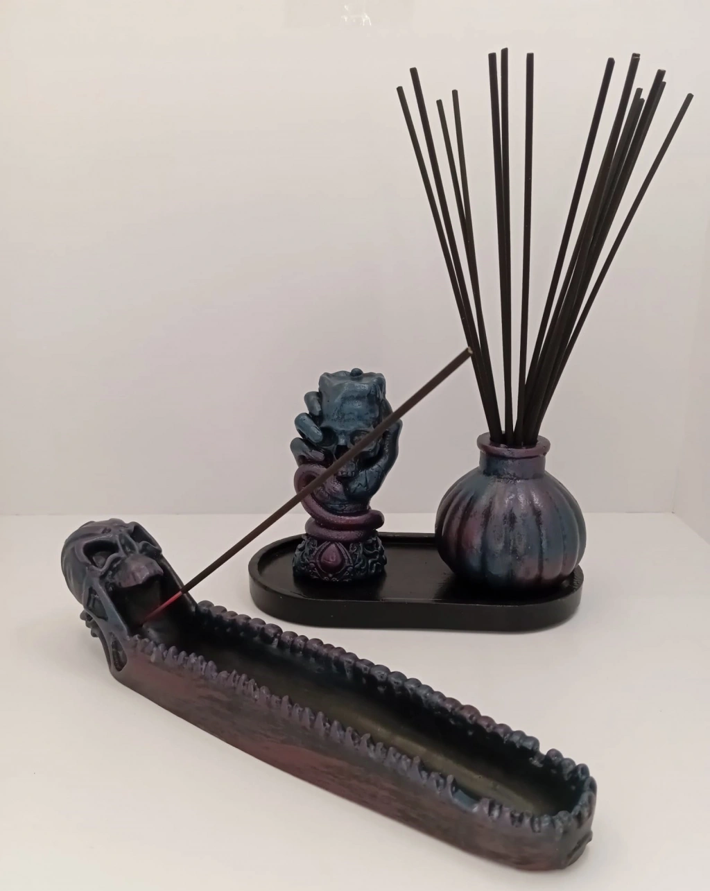 Mistik kuru kafa tasarımlı set, güçlü ve dikkat çekici görünümüyle yaşam alanlarınıza farklı bir karakter kazandırır. Kuru kafa figürlü çubuk tütsülük ve 3’lü dekoratif vazo kombinasyonu sayesinde bu ürün, hem fonksiyonel hem de estetik bir dekoratif set olarak öne çıkar.